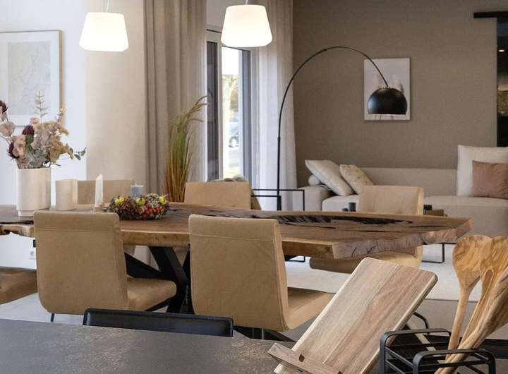 Dies erreichen wir durch durchdachte Raumlösungen wie dem ausgefallenen Ess- und Küchenbereich, bei dem sich die Küchenzeile entlang der gesamten Wandbreite zieht. An diesen offenen Gemeinschaftsbereich schließt sich das moderne Wohnzimmer an, das zum Verweilen einlädt. Ein Gäste-WC sowie der Hauswirtschaftsraum komplettieren das Raumkonzept des Erdgeschosses.