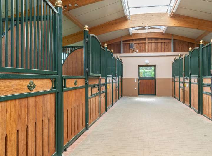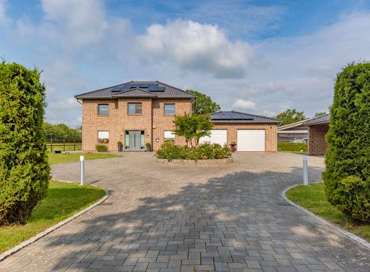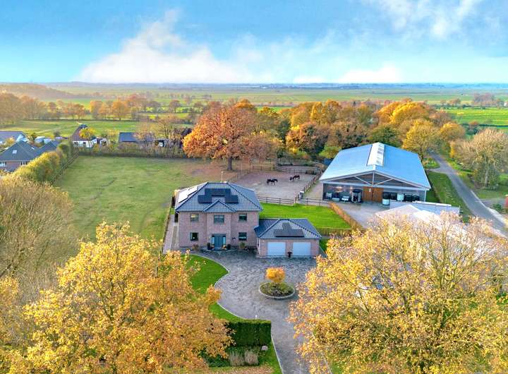 Dieses besondere Reitanwesen, im Jahr 2014 erbaut, strahlt eine zeitgemäße Eleganz aus und befindet sich in ländlicher Lage nahe der Nordsee. Der moderne Wohnbereich beeindruckt mit großzügiger ca. 253 m² Wohnfläche und ist von einem weitläufigem Grundstück mit insgesamt ca. 1,6 ha inklusive großzügiger Weideflächen umgeben. Das Wohnhaus empfängt mit einem einladenden hellen Eingangsbereich. Ein Wohn- und Essbereich mit einem Kaminofen, eine hochwertig ausgestattete offene Küche mit angrenzender Speisekammer sowie ein einladender Wintergarten schaffen eine Atmosphäre des Wohlbefindens. Ein zusätzliches Zimmer bietet flexible Nutzungsmöglichkeiten, während ein Duschbad, ein praktischer Hauswirtschaftsbereich mit direktem Zugang zur geräumigen Doppelgarage und zum Heizungsraum den Alltag erleichtern. Der Wintergarten und die überdachte Terrasse, beide mit Beschattungsanlage, bieten herrliche Rückzugsorte und führen direkt zum gepflegten Gartenbereich. Im Obergeschoss stehen ein Schlafzimmer mit Ankleide, zwei weitere Zimmer für individuelle Bedürfnisse, ein Vollbad sowie ein Abstellraum zur Verfügung. Die gesamte Immobilie wird durch eine Fußbodenheizung erwärmt, die umweltfreundliche Erdwärme als Energiequelle nutzt. Zusätzlich unterstützt eine Solaranlage seit 2022 die energetische Versorgung mit 10 kW Leistung. Alle Fenster des Wohnhauses sind mit praktischen Rollläden versehen. Die Stallungen direkt am Haus bieten sieben hochwertige Röwer & Rüb Pferdeboxen. Die Sattelkammer mit einer Küchenzeile und Waschmaschinenanschluss sowie ein Gäste-WC vervollständigen diesen Bereich. Für beste Trainingsmöglichkeiten sorgt die moderne Reithalle mit WLAN, einem Soundsystem, effizienter Beleuchtung und einer Sprinkleranlage. Die Reithalle und der Pferdestall wurden von der Firma Schütt erbaut. Ein beleuchteter Reitplatz und ein Round-Pen befinden sich in unmittelbarer Nähe. Das Anwesen verfügt über eine Hauskoppel und eine weitere Koppel, die das Angebot abrunden. Zusätzlich können weitere Weideflächen von ca. 2 ha dazu gepachtet werden. Die Sicherheit der Tiere und des gesamten Anwesens ist dank einer umfassenden Videoüberwachung gewährleistet. Eine zusätzliche Garage und ein Carport bieten ausreichend Platz für Fahrzeuge und Equipment. Hier findet modernes und großzügiges Wohnen in perfekter Harmonie mit der Pferdehaltung seine Verwirklichung. Ein Leben auf diesem exklusiven Reitanwesen verspricht ein unvergleichliches Erlebnis für Pferdeliebhaber und Menschen, die das Besondere suchen. Lassen Sie sich von der einzigartigen Atmosphäre begeistern und kontaktieren Sie uns gerne für weitere Informationen. Wir freuen uns auf Ihren Anruf.