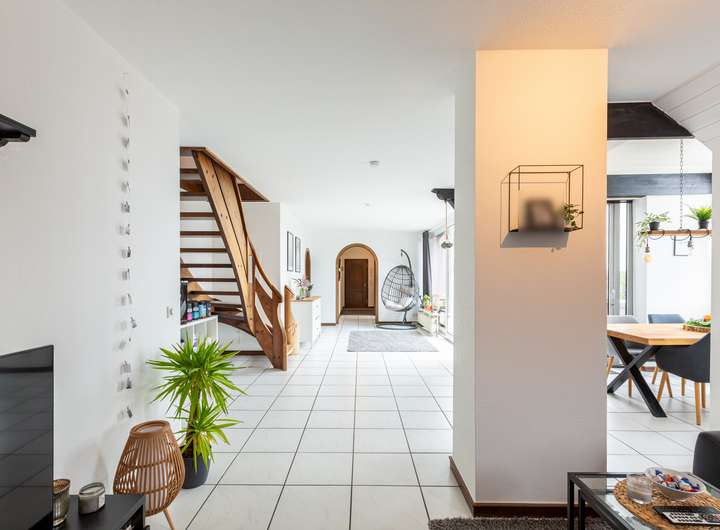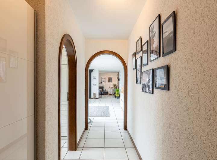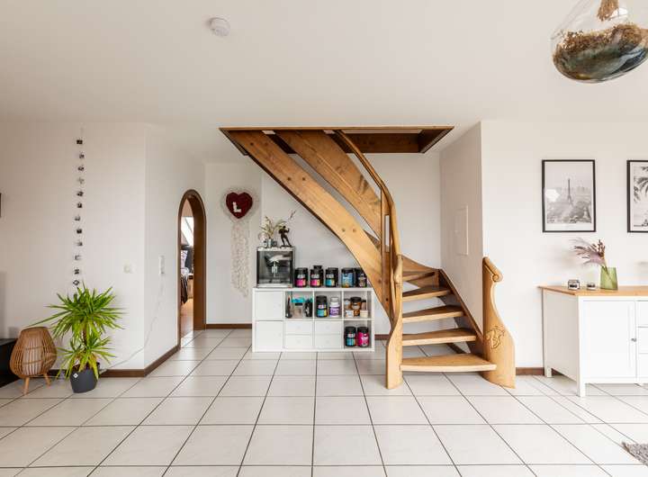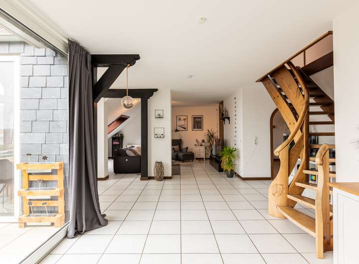 Über die helle Diele gelangen Sie in das wunderbare, geräumige und offen konzipierte Wohnzimmer mit Blick auf die maßangefertigte, nach individuellen Wünschen konzipierte Treppe in den ausgebauten Spitzboden.