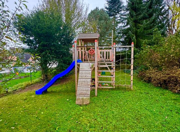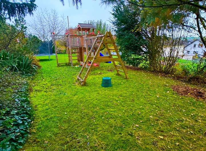 Der beeindruckend große Garten ist ein absolutes Highlight und ein Paradies für Groß und Klein: Ein umzäunter Teich lädt zu ruhigen Momenten ein, und der Spielturm mit Schaukeln bietet jede Menge Spaß und Bewegung für die Kleinen. Ein liebevoll angelegtes Hochbeet erfüllt die Wünsche aller Hobbygärtner, während Apfel-, Kirsch- und Birnbäume für frische Früchte direkt vor der Haustür sorgen. Eine kleine Gartenhütte bietet praktischen Stauraum – hier finden Sie ausreichend Raum für all Ihre Ideen.