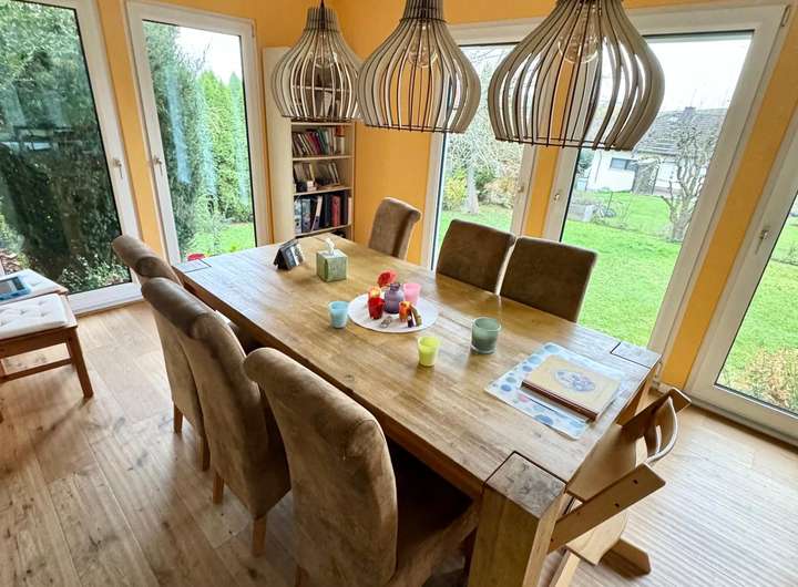 Willkommen in Ihrem neuen Traumhaus! Dieses freistehende Einfamilienhaus vereint großzügigen Raum, durchdachte Details und eine besondere Nähe zur Natur – ideal für Familien, die das Besondere suchen. Auf ca. 226 m² Wohnfläche mit 7 Zimmern und einem beeindruckenden Grundstück von 1.134 m² bietet dieses Haus viel Platz für individuelle Lebensräume und eine außergewöhnliche Lebensqualität. Dank der hervorragenden Energieeffizienz (k-Wert von 0,28) genießen Sie ein nachhaltig angenehmes Wohnklima und niedrige Heizkosten.