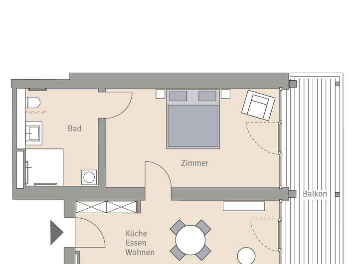Über zwei im Haus vorhandene Fahrstühle gelangen Sie in die gewünschte Wohnetage. Das hier dargestellte 2-Zimmer-Apartment befindet sich in der Ebene 4. Große Fensterfronten erhellen die Räumlichkeiten und laden zum Verweilen ein. Der großzügige Balkon ermöglicht sonnige Kaffeekränzchen mit Freunden und Nachbarn.