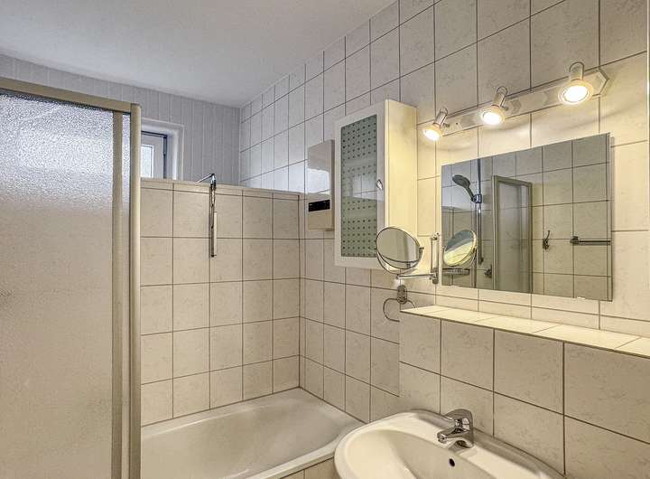 Ein einladender Flur führt Sie in das lichtdurchflutete Wohnzimmer mit praktischem Einbauschrank, ein stilvolles Esszimmer, zwei gemütliche Schlafzimmer sowie ein Büro (1/2 Zimmer). Die Küche ist mit einer Einbauküche ausgestattet und bietet eine angrenzende Vorratskammer mit Waschmaschinenanschluss. Ein Badezimmer mit Tageslicht rundet das Raumangebot auf dieser Ebene ab.