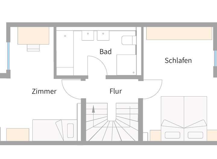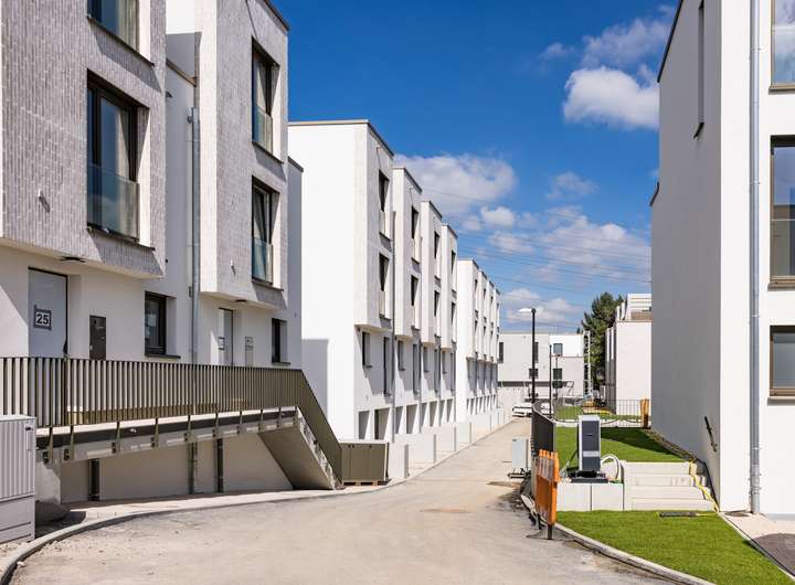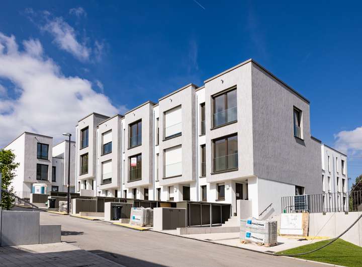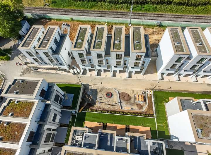 Insgesamt kommen zwei Doppelhaushälften im Typ A.2 zum Verkauf. Die Grundrisseinteilung ist klassisch, im Erdgeschoss befindet sich ein Wohn-Essbereich mit offener Küche und Gäste-WC, im Obergeschoss zwei Schlafzimmer mit Bad und im Dachgeschoss ein sonniges Studio mit hübscher, rd. 15 m² großen Dachterrasse.
