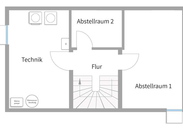 Das Gebäude ist unterkellert. Hier befinden sich zwei großzügige Abstellräume sowie ein Technikraum, in dem die Heizung und der Waschmaschinen-/Trockneranschluss untergebracht sind.