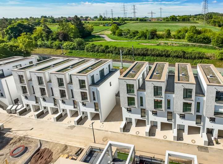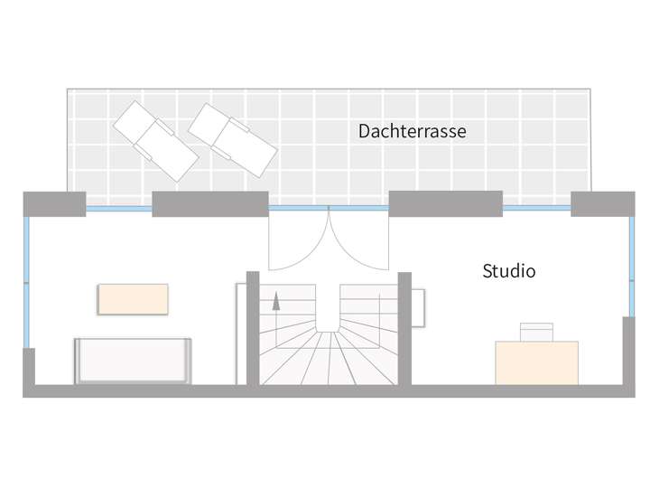Die Häuser sind auf vier Ebenen verteilt. Im Untergeschoss betritt man durch den Hauseingang direkt den Flur, von dem aus eine Treppe in die Ebene E1 führt. Die Ebene E0 umfasst zusätzlich eine Garage sowie einen Abstellraum, in dem die Heizung und die Anschlüsse für Waschmaschine und Trockner untergebracht sind. In der Ebene E1 eröffnet sich ein großzügiger und offener Wohn-, Ess- und Küchenbereich, der direkten Zugang zur Terrasse und zum Gartenanteil nach Südwesten bietet. Auf dieser Ebene ist zusätzlich ein separates WC geplant. Über den Treppenaufgang gelangt man in die Ebene E2. In dieser Etage befinden sich zwei Schlafräume, welche durch das in der Mitte liegende Badezimmer getrennt werden. Das Badezimmer wird mit einer Badewanne und einer Dusche sowie einem WC und zwei Waschbecken ausgestattet. Das großzügige Studio mit Zugang zur Dachterrasse liegt im Dachgeschoss in der Ebene E3. Durch das Flachdach kann der Raum als vollwertiger Raum genutzt werden.