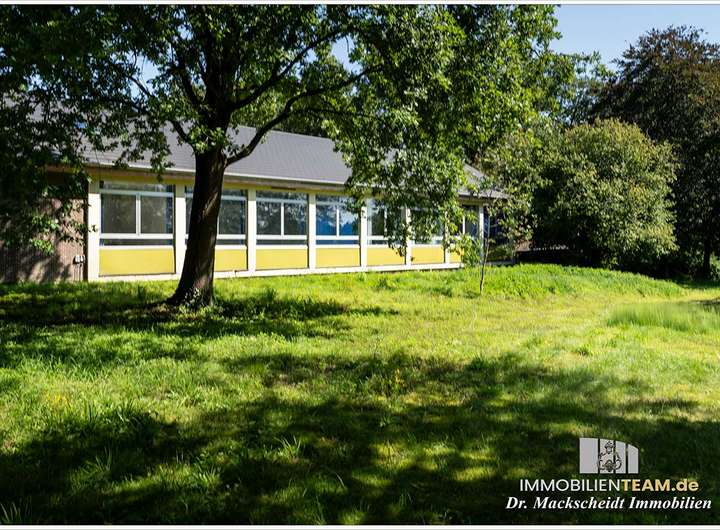 Das angebotene Gebäude ist eine ehemalige Grundschule aus den 1960er Jahren. Es befindet sich am Rand des Hünxer Bachtals, in unmittelbarer Nähe zum Waldrand.