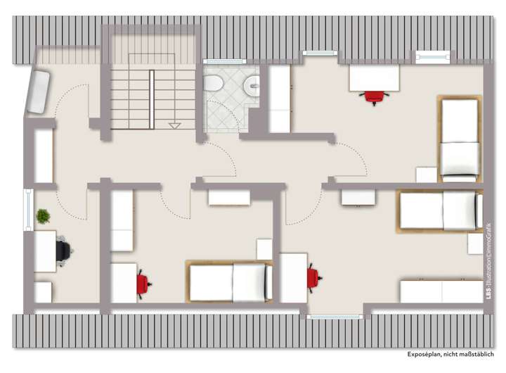 Insgesamt drei Schlafzimmer, ein kleines Büro und ein Gäste-WC befinden sich im Dachgeschoss.