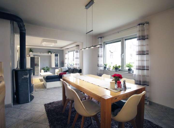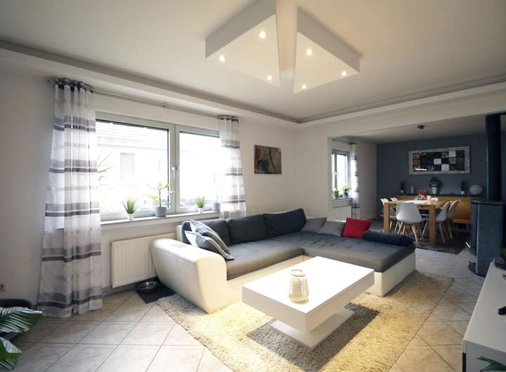 Die ca. 125 m² Wohnfläche verteilen sich über zwei Wohnebenen. Im Erdgeschoss empfängt Sie ein großzügiger Wohn- u. Essbereich, ein Tageslichtbad und die Küche.