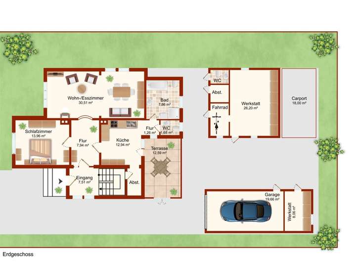 Die Immobilie ist teilweise unterkellert, verfügt über eine Garagen mit Grube, einen massiven Schuppen mit diversen Abstellräumen und ein großes Carport.