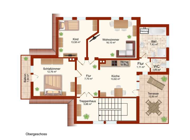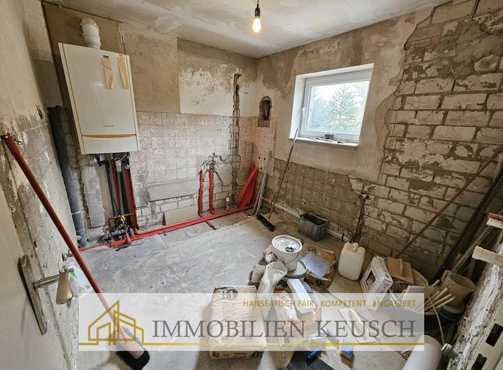 Im Obergeschoss befinden sich drei weitere Zimmer, ein Dusch- und Wannenbad ( noch im Rohbau ), eine Küche mit Sitzgelegenheit und Zugang zu einer möglichen Terrasse.