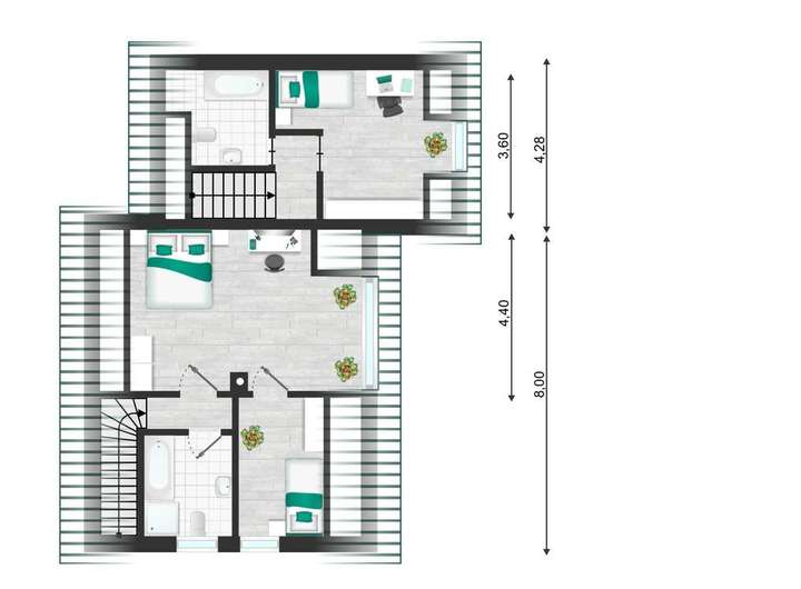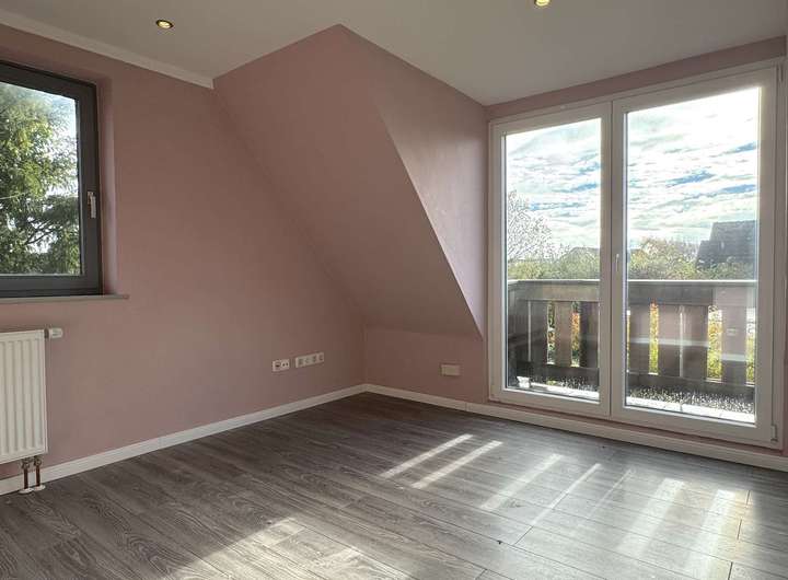 Der Anbau bietet im Erdgeschoss ein gemütliches Wohnzimmer mit einem halboffenen Bereich für eine Küchenzeile sowie Zugang zur sonnigen Süd-Terrasse. Ein zusätzlicher Raum und ein Gäste-WC runden das Erdgeschoss ab. Im Obergeschoss des Anbaus befinden sich ein Schlafzimmer mit kleinem Balkon sowie ein Duschbad.