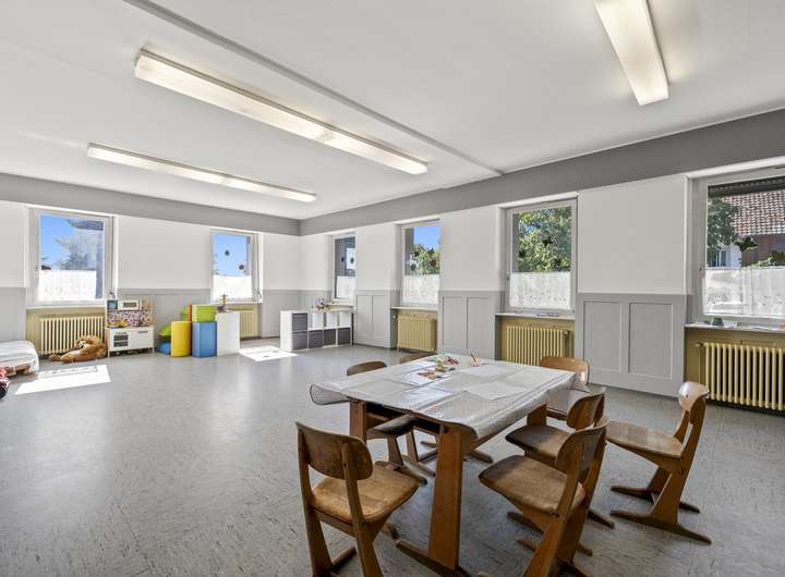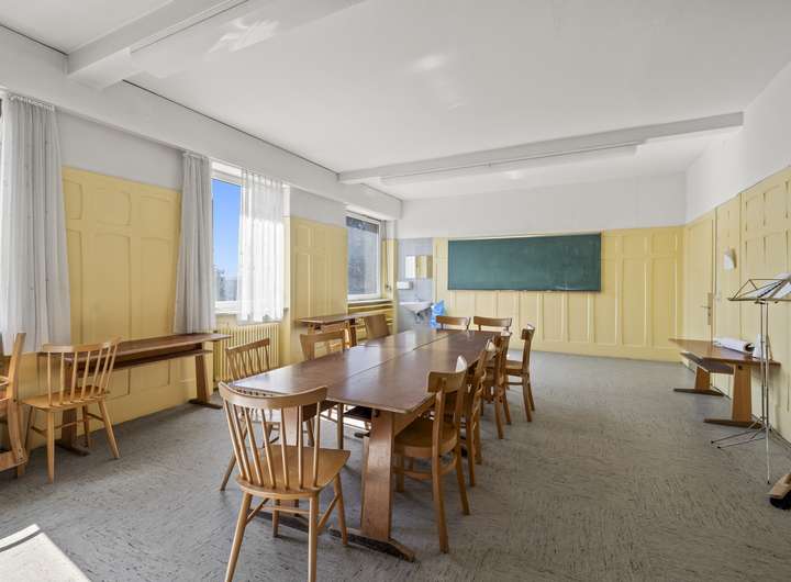 Im geräumigen Untergeschoss befinden sich die ehemaligen Klassenzimmer, die sich ideal als lichtdurchflutete Gewerberäume anbieten. Perfekt für Praxisräume, Büroräume oder kreative Studios. Alternativ können die Flächen mit etwas Umgestaltung zu einer oder mehreren Wohneinheiten umgebaut werden – hier sind Ihrer Fantasie keine Grenzen gesetzt.