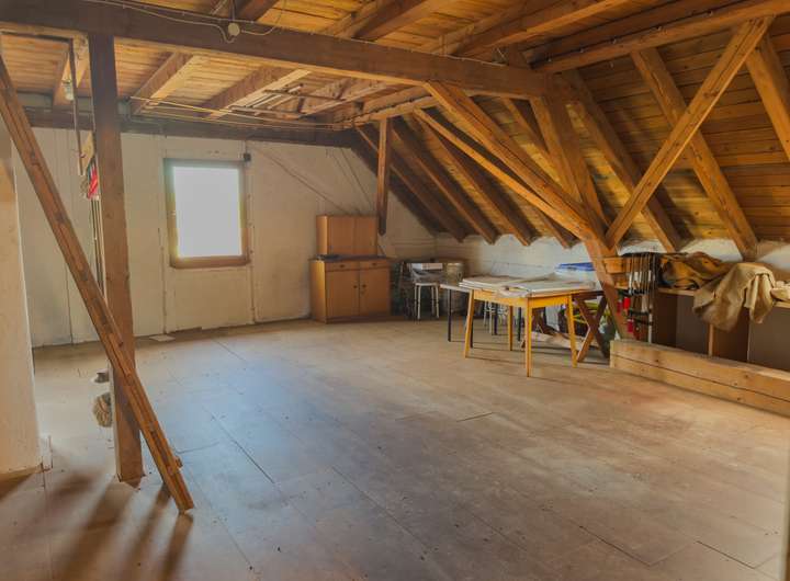 Insgesamt stehen ca. 270 m² Wohnfläche zur Verfügung. Das Obergeschoss besticht durch einen weitläufigen Balkon, der sich über die gesamte Hausbreite zieht und einen herrlichen Ausblick auf die umliegende Natur bietet – ein erweiterter Wohnraum unter freiem Himmel. Der vollständig ausgebaute Dachboden eröffnet zudem zusätzliches Ausbaupotenzial, etwa für ein Atelier, ein Jugendzimmer oder einen privaten Arbeitsbereich.