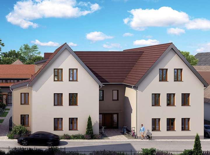 Auf dem ehemaligen Gelände des Landgasthauses "Zum Grünen Baum" in Hanau Klein-Auheim entstehen 2 Mehrfamilienhäuser mit insgesamt 22 modernen 1- bis 4-Zimmer-Neubau-Eigentumswohnungen und in der denkmalgeschützten Scheune ein Einfamilienhaus.