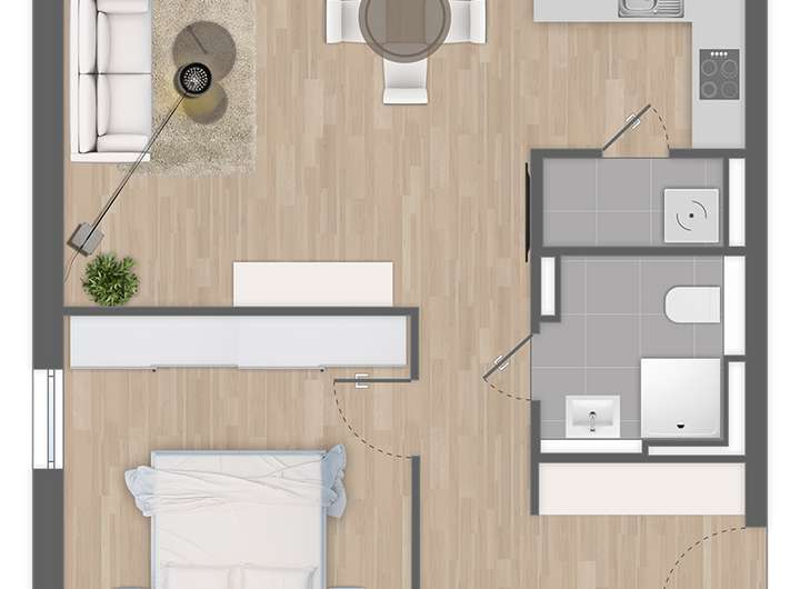 *Küchenaktion: Bei Kauf einer 1- bis 2-Zimmer-Eigentumswohnung bis zum 31.03.2026 erhalten Sie eine Küche inklusive.