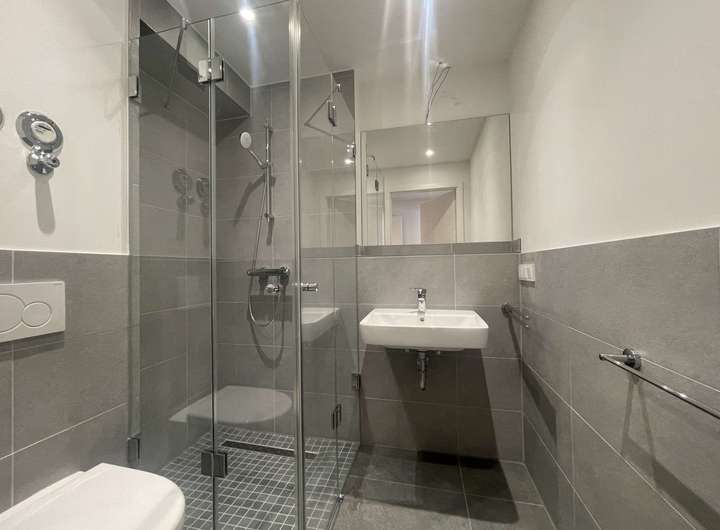 Dieses großzügige Apartment befindet sich im 1. OG vorne rechts und verfügt über einen 11 qm großen seitlich angeordneten Balkon. Der Wohn- / Schlafraum ist mit bodentiefen Fenstern versehen, welche den Raum erhellen und eine moderne Einbauküche ist seitlich angeordnet. Elektrische Außenrollladen sind an den Fenstern vorhanden. Das Badezimmer verfügt über eine Dusche mit Regenschauer und Glasabtrennung.
