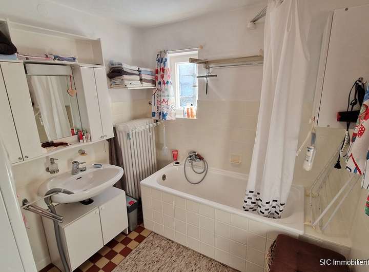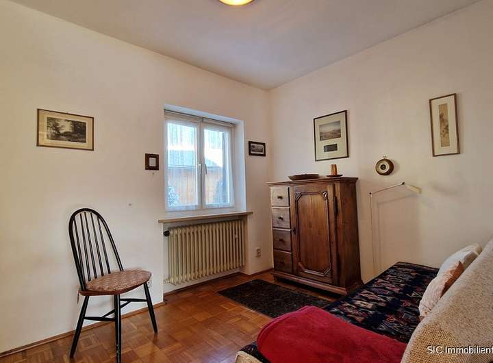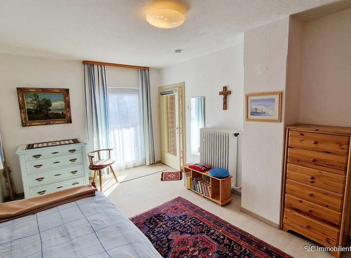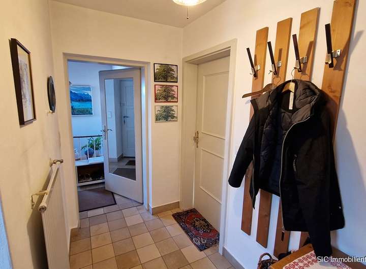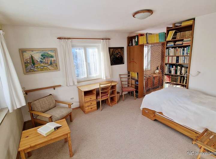 Im Erdgeschoss erwartet Sie eine gute und großzügige Raumeinteilung. Die großen und zahlreichen Fenster lassen die Räume hell und freundlich wirken. Hier finden Sie die Wohnküche, ein Badezimmer mit Wanne, eine Toilette und das Wohnzimmer. Neben dem Wohnzimmer befindet sich ein zusätzliches Zimmer, welches sich ideal als Büro anbietet. Zwischen dem Wohnzimmer und der Küche ist ein heller Essbereich mit Eckbank. Hier können Sie auch mehrere Gäste empfangen. Im Obergeschoss finden Sie zwei Schlafzimmer, eines davon mit eigenem Badezimmer. Besonders hervorzuheben ist hier der tiefe Süd-Ostbalkon mit Bergblick.