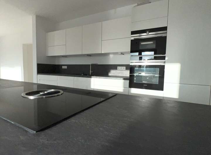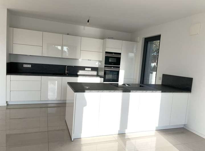 Die eingebaute edle Küche besteht aus einer Kochinsel und einer hochwertigen Küchenzeile. Die schönen Elektrogeräte sind von Markenherstellern.