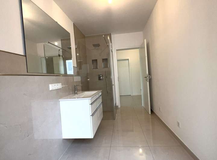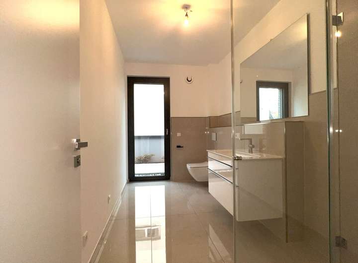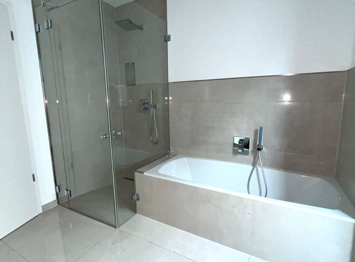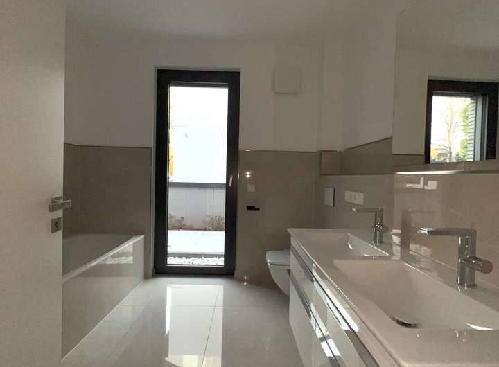 Das ebenfalls mit erlesenen italienischen Fliesen in großem Format ausgestattete 2. Badezimmer besticht durch seine edlen Doppelwaschbecken und Villeroy & Boch Armaturen.