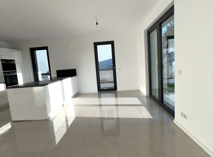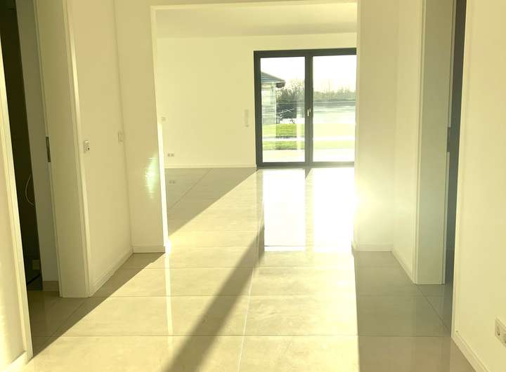Über einen großzügigen Eingangsbereich betritt man den großen und hellen Wohnraum mit offener Küche.