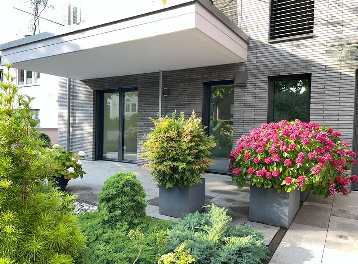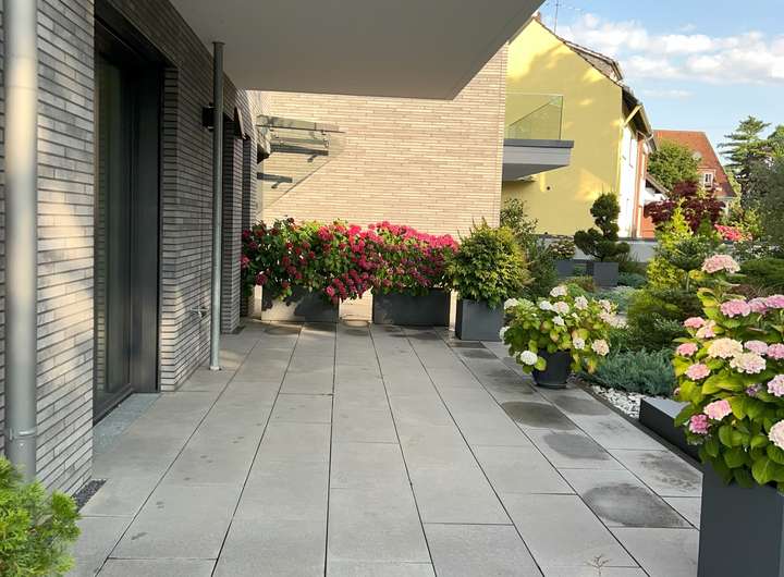 Die Wohnung verfügt über 2 große Terrassen : nach vorne und nach hinten raus. Im hinteren Bereich lädt sie ein in den wunderschönen weitläufigen Grünbereich zu blicken.