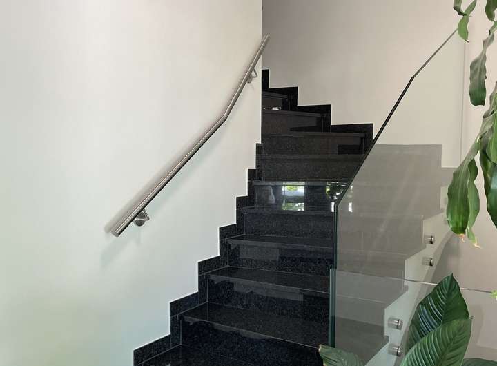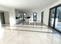 Alle Flächen sind mit feinen hellen italienischen Bodenfliesen in großem Format ausgelegt.
