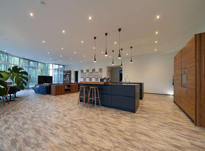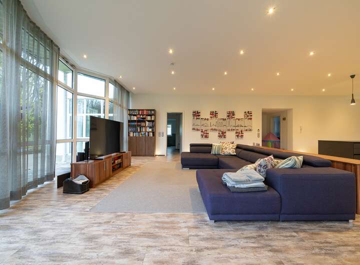 Die Wohnfläche von ca. 278 m² erstreckt sich harmonisch und praktisch auf einer Ebene und überzeugt mit architektonischer Klarheit, großzügigen Proportionen und einem edlen, zeitlosen Interieur. Das Herzstück der Villa bildet der offen gestaltete Wohn-/Ess- und Kochbereich mit einer beeindruckenden Glasfront, die den Blick in die grüne Oase freigibt und die Natur zum integralen Bestandteil des Wohnraums macht. Die hochwertige Küche mit integrierter Theke fügt sich nahtlos in das elegante Gesamtkonzept ein – ein Ort für genussvolle Begegnungen mit Familie und Gästen.