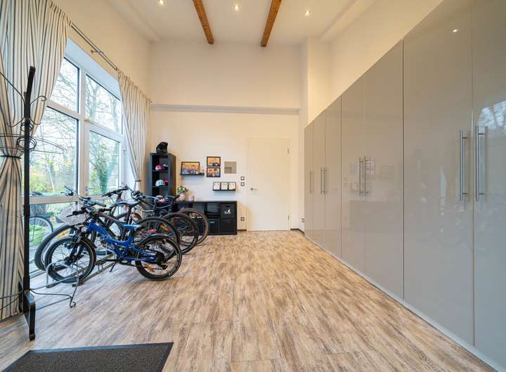 Insgesamt sechs stilvoll gestaltete Zimmer bieten vielfältige Nutzungsmöglichkeiten. Besonders hervorzuheben ist das Elternschlafzimmer mit freistehender Badewanne, luxuriösem Bad en Suite, separatem Ankleidebereich und direktem Blick ins Grüne – ein exklusiver Rückzugsort mit Hotelcharakter. Zwei Maisonette-Kinderzimmer mit eigenen Terrassen bieten den jungen Bewohnern individuelle Rückzugsräume in naturnaher Umgebung. Ein separates Kinderbad sowie ein weiteres Zimmer für Gäste oder Au Pair und ein Büro unterstreichen die flexible Nutzung des Hauses.