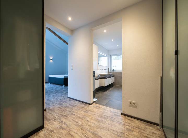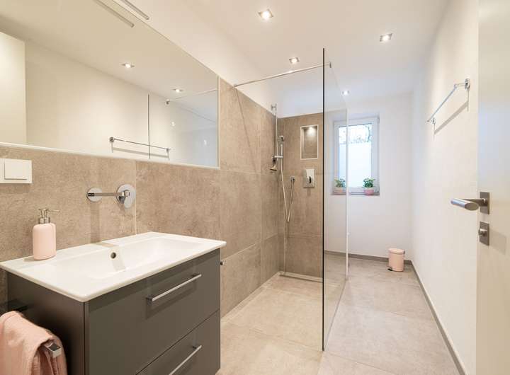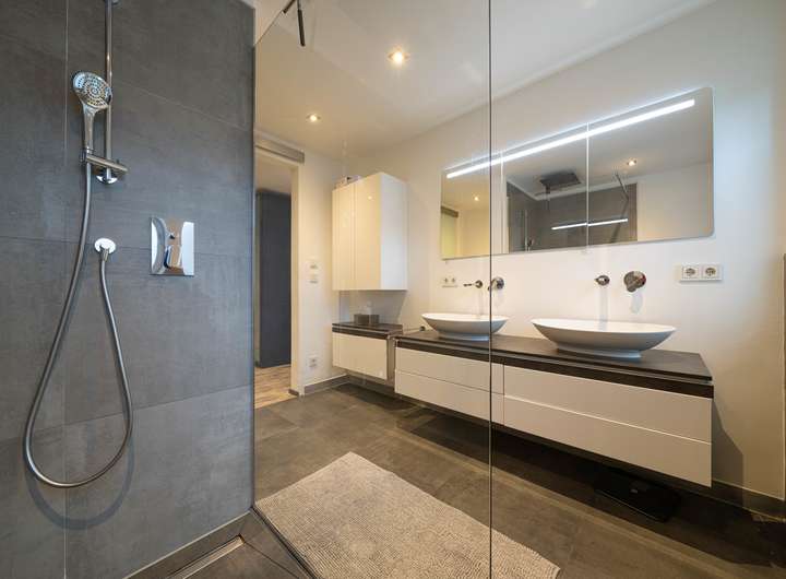 + Bad en Suite mit Doppelwaschtisch, bodengleicher Dusche + WC