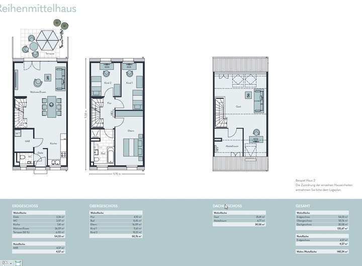 Im Erdgeschoss findet das Leben statt: Wohnzimmer und Koch-/Essbereich sind offen und klar strukturiert; großformatige Fenster lassen viel Licht in die Räume und ermöglichen den Zutritt zu Terrasse und Garten, die bei schönem Wetter zum zusätzlichen Wohnzimmer werden. Ergänzt wird die Etage durch Diele, Gäste-WC und Technikraum. wo u.a. Waschmaschine und Trockner ihren Platz finden.