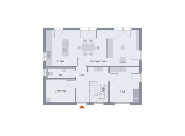 Ein echter Blickfang des Design 12 ist die Fassade, die durch ihre farbige Gestaltung zum echten Hingucker wird. Doch auch die Räume unter dem Satteldach haben auf mehr als 160 m² Wohnfläche vieles zu bieten: Von der Diele haben Sie Zugang in die Küche mit angeschlossenem Wohn-Ess-Bereich. Im Erdgeschoss führen fünf Türen nach draußen und sorgen zugleich für viel Licht. Ebenfalls auf dieser Etage: WC, Hauswirtschaftsraum sowie ein weiterer Raum, der als Gästezimmer oder Büro genutzt werden kann.