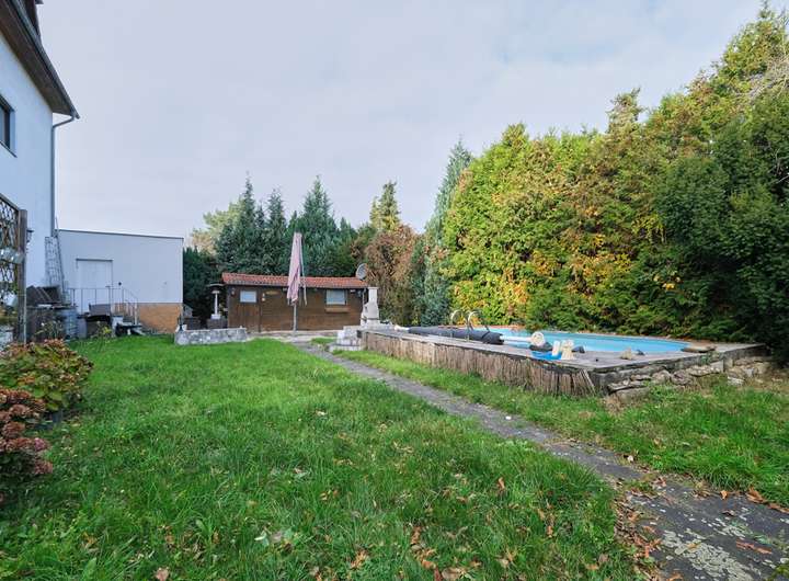 Im Garten des Gebäudes befinden sich ein Pool, ein Gartenhaus aus Holz, ein Garagenanbau sowie ein weiteres Nebengebäude.