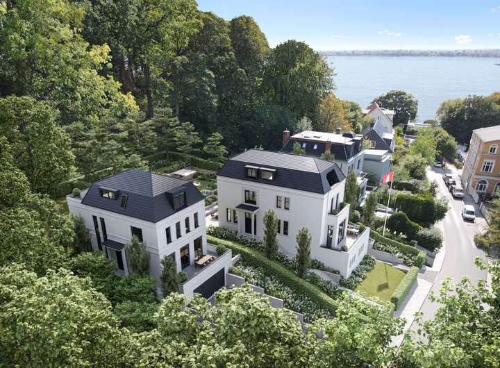 Das Grundstück am Falkentaler Weg bietet nach vorne heraus einen spektakulären Fernblick über die nur 100 m entfernte Elbe. Nach hinten heraus ermöglichen die unverbaubare Hanglage und der alte Baumbestand ein Höchstmaß an Privatsphäre. Dieses ca. 750 qm große Grundstück der Superlative verlangt geradezu nach einer Villa, die das große Potenzial architektonisch aufgreift. So öffnet sich die Wohnetage der 480 qm Villa nach hinten heraus ebenerdig über große Fensterfronten mit einer Deckenhöhe von 3,30 m zum terrassierten Außenbereich. In anderer Richtung ergibt sich eine spektakuläre Sichtachse durch die ineinander übergehenden Räume bis auf die in sieben Meter Höhe liegende vordere Terrasse mit Elbblick. Repräsentativer lassen sich Gäste nicht empfangen und bewirten. In der Endetage befindet sich das großzügige en Suite Schlafzimmer mit Ankleide und Wellnessbereich. Auf der Kinder-Etage bieten drei Zimmer und ein Duschbad mit getrenntem WC viel Platz. Mit Photovoltaik-Anlage und einer Energieeffizienz von A+ setzt das Haus auch energetische Maßstäbe.