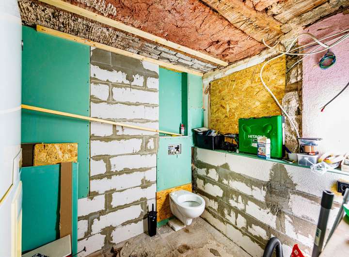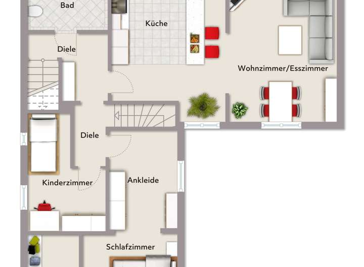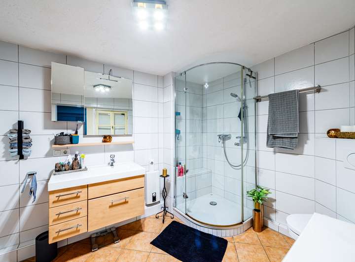 Im Erdgeschoss befindet sich ein Wohn- oder Schlafzimmer mit Duschbad. Im Obergeschoss stehen ein großes Schlafzimmer mit Ankleide und begehbarem Kleiderschrank, ein Kinder-/Arbeitszimmer, eine große Wohnküche mit angrenzendem offenen Wohn-/Essbereich sowie einem Badezimmer zur Verfügung. Das Badezimmer ist noch mit Fliesen und Sanitärobjekten fertigzustellen.
