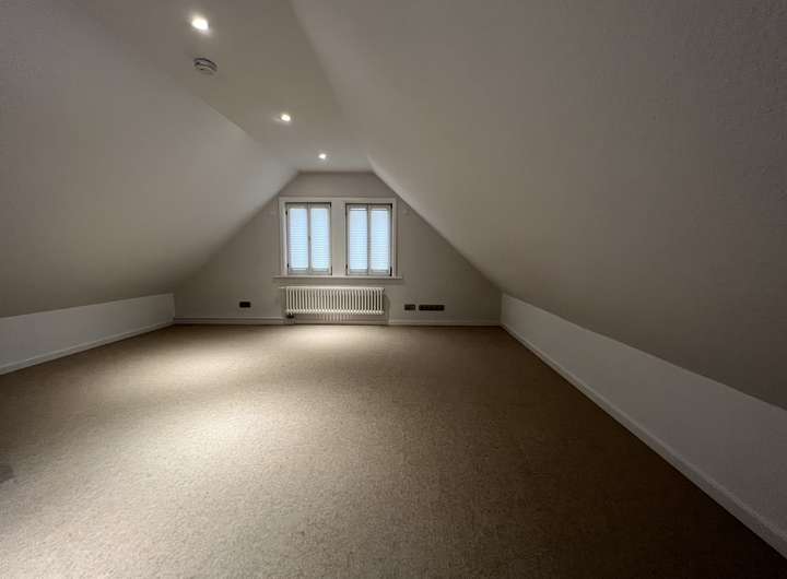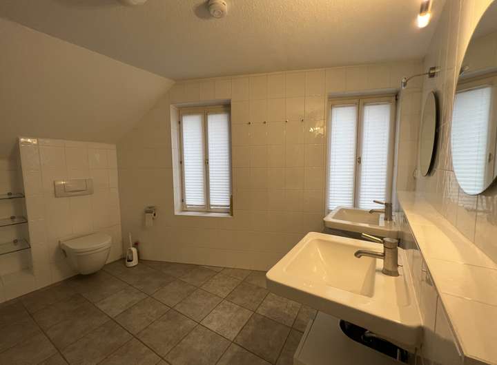 Das im 1. Obergeschoss befindliche Badezimmer bietet Tageslicht und ist großzügig geschnitten. Es verfügt über eine Badewanne, zwei Waschbecken und ein WC. Liebevolle Details wie die Wandnischen mit gläsernen Einlegeböden sehen nicht nur schick und zeitgemäß aus, sondern bieten zusätzliche Abstellfläche. Ein Handtuchwärmer sorgt für eine angenehme Wärme im Raum. Die drei weiteren Räume können Sie Arbeitszimmer, Ankleidezimmer und Hobbyraum nutzen.