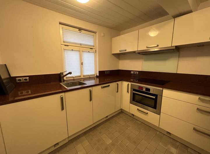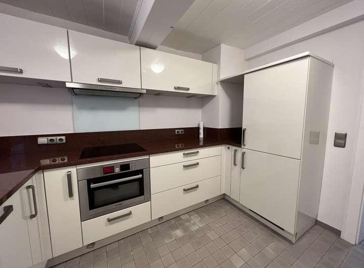 Die Küche ist bereits mit einer vollausgestatteten Küchenzeile versehen und bietet unter anderem einen Konvektomat und eine Kühl-Gefrierkombination. Hier können Sie sofort loslegen und mit Familie und Freunden kochen. Auch ein Waschtrockner wurde in die Küchenzeile integriert und gekonnt hinter einer Blende versteckt. Das Esszimmer grenzt an die Küche an. Besonders praktisch: Eine Durchreiche schafft eine Verbindung zwischen Küche und Esszimmer. Freigelegte Holzbalken und die Vertäfelung an den Wänden schaffen ein schönes Zusammenspiel zwischen Alt und Neu.