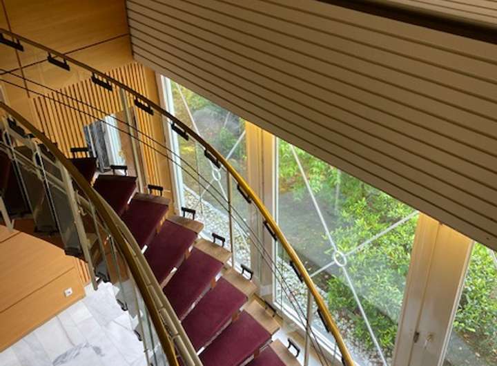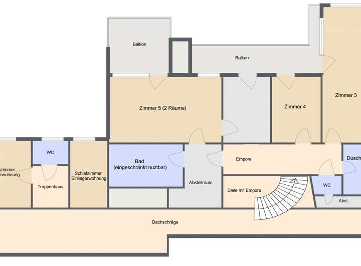 über eine großzügige Wendeltreppe mit Massivsteinstufen, es gliedert sich funktionell in zwei Hauptbereiche. Zum einen in einen Kinder-/Gästebereich mit zwei Zimmern und einem hellen