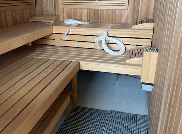 Der Schwimmbadtrakt verfügt neben einer Sauna und Wärmekabine über eine Duschanlage und ein WC, beides in