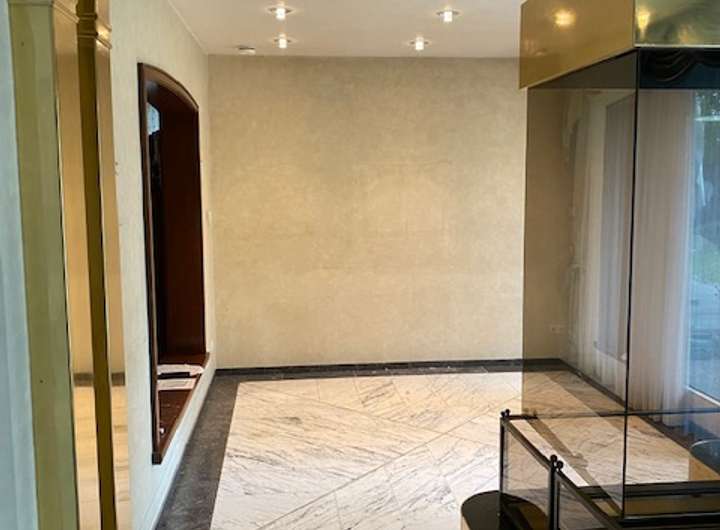Im Erdgeschoss gelangt man über die mit Marmor ausgelegte Diele mit stylischem Marmor Gäste-WC zum einen, in die großzügige Küche zum anderen in den eleganten Wohn- / EssTrakt. Der von drei Seiten verglaste Kamin dient hier ebenso wie Splitt Level als Raumteiler. Durch bodentiefe Fenster und große Fensterflächen wird für eine angenehme Wohnatmosphäre