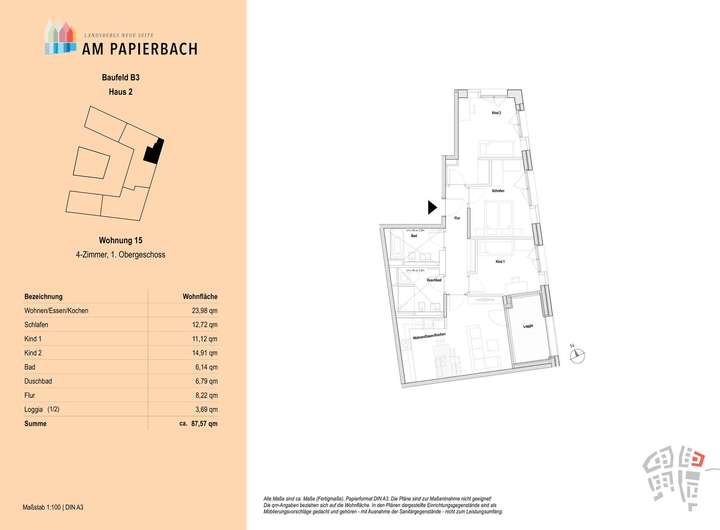 Als eines von zwei Wohngebäuden "Am Papierbach" bietet der neue Bauabschnitt exklusive Blicke über den Lech bis in die Altstadt. Durch die prominente Lage erreichen Sie über den Lady-Herkomer-Steg in wenigen Minuten die Landsberger Altstadt oder das Zentrum des Quartiers.