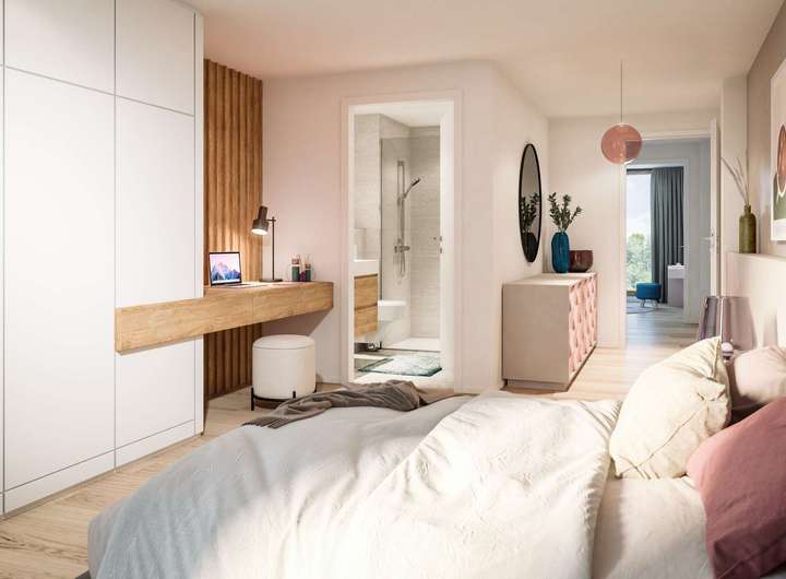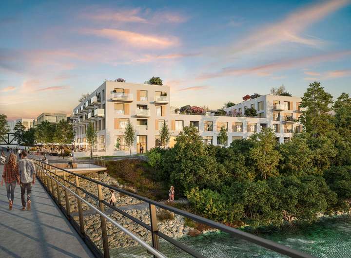 - 75 % weniger CO2 im Vergleich zu Gas- und Ölheizungen: Die Energieversorgung des Quartiers erfolgt durch Wärmerückgewinnung mittels einer Grundwasser-Wärmepumpe. Diese nutzt die thermische Energie im Grundwasser und ist durch die dortigen, gleichbleibenden Temperaturen ganzjährig besonders effizient. Das schont nicht nur die Umwelt, sondern auch Ihr Portemonnaie.