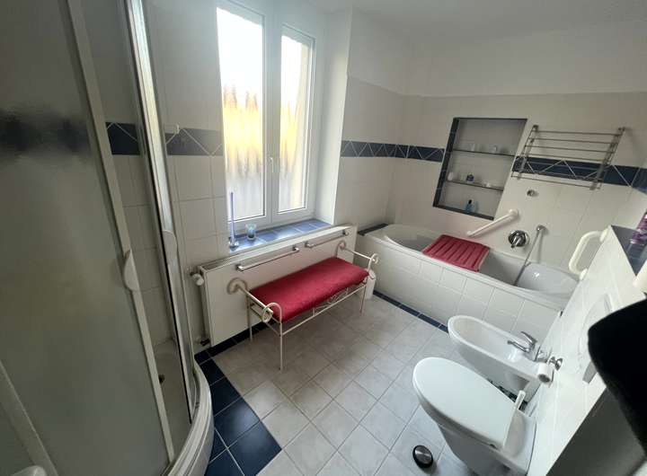 Zusätzlich gehören 4 Kellerräume, 4 Stellplätze vor dem Haus sowie (optional) eine große Garage zum Mietobjekt. Einer der Kellerräume ist so ausgestattet, dass er z.B. gut als Hobbyraum genutzt werden könnte.