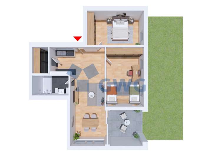 Besonders attraktiv sind die gemütliche Loggia und der eigene Gartenanteil – perfekt für entspannte Stunden im Freien, Spielen mit den Kindern oder einfach um zur Ruhe zu kommen.