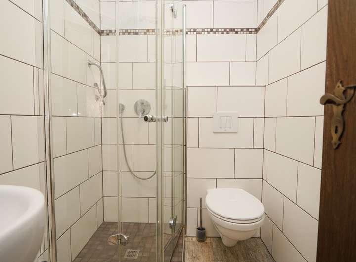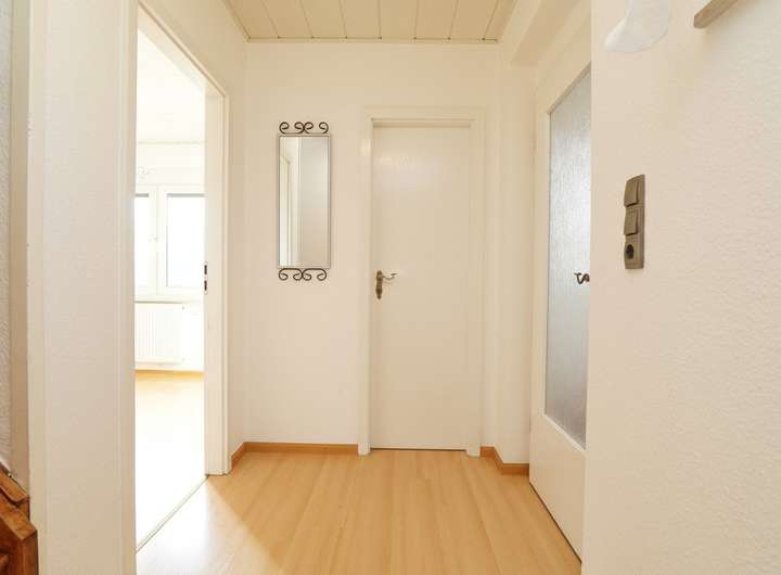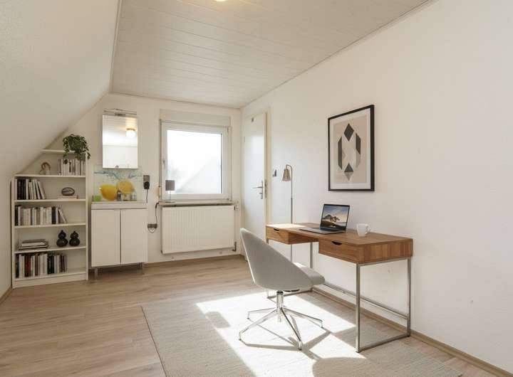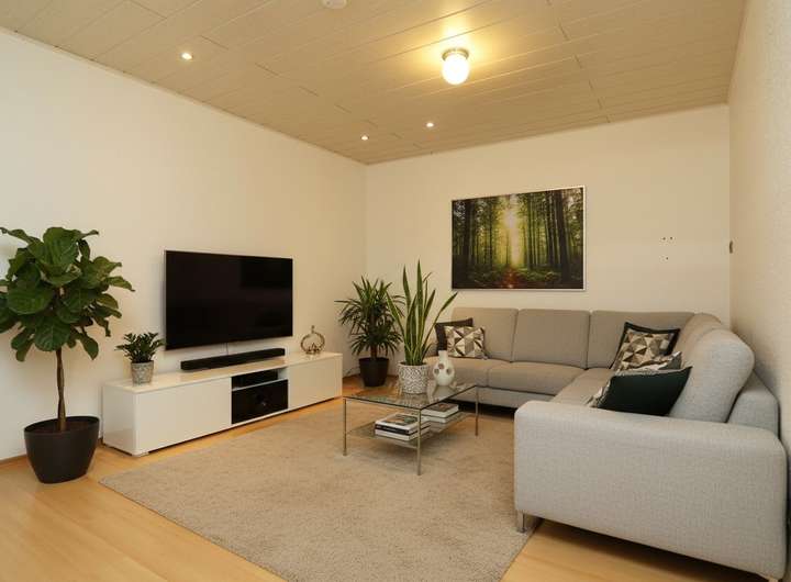 Im Erdgeschoss erwartet Sie ein Wohnzimmer mit einem großen Fenster, das eine einladende Atmosphäre schafft - ideal zum Entspannen. Angrenzend befindet sich die Küche, aktuell ohne Einbauküche. Der Wohnbereich wurde 2019 modern renoviert. Ein Badezimmer mit Dusche und Fußbodenheizung rundet das Erdgeschoss ab.