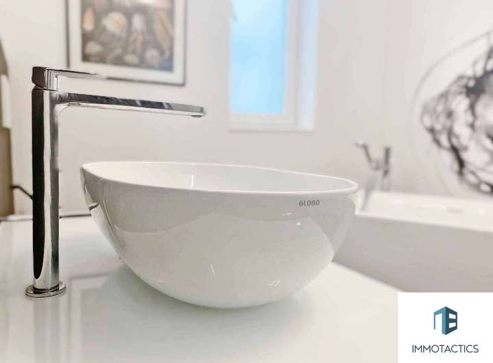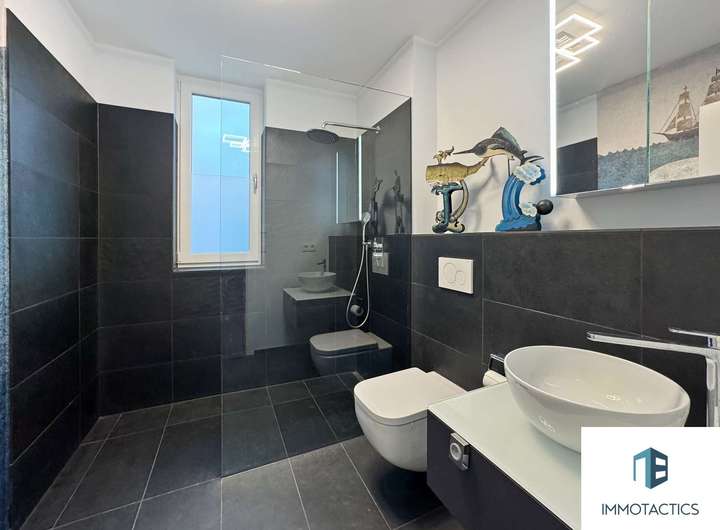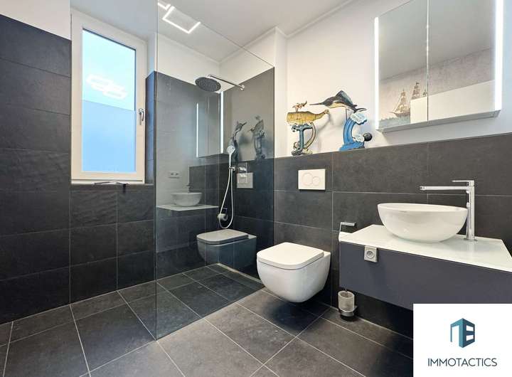 Hochwertige Zusatzleistungen wie LED-Dimmerrelais, aufwendige Malerarbeiten und eine elegante Glasinnentür runden das Gesamtbild ab.