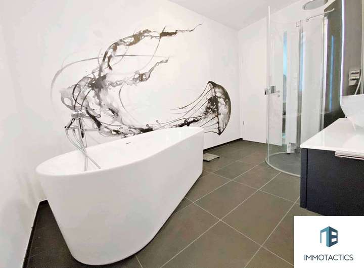 Luxuriöse Bäder: Ein lichtdurchflutetes Hauptbadezimmer mit freistehender Badewanne und Dusche sowie ein zusätzliches Duschbad – beide mit Fenstern und exklusiver Ausstattung.