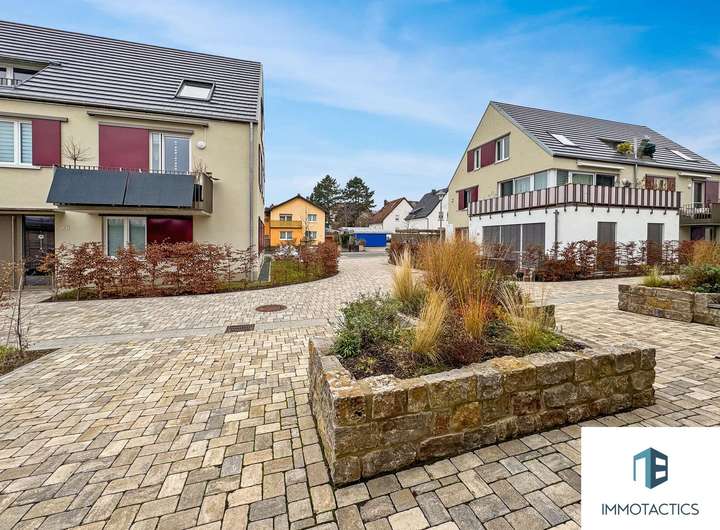 Gemeinschaftliche Atmosphäre: Verkehrsfreie Wohnhöfe mit Spiel- und Sitzmöglichkeiten, Gemeinschaftsflächen und direkter Anbindung an die Dorfgemeinschaft.