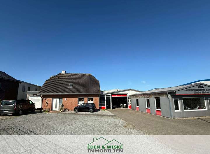 Herzlich Willkommen im Gewerbegebiet von Norden - egal ob Handwerksbetrieb, KfZ-Werkstatt oder gewerblicher Handel, in dieser Immobilie finden Sie viele Möglichkeiten für Ihre Selbstständigkeit! Dieses Einfamilienhaus, mit angrenzender und gut etablierter Werkstatt, wurde 1993 in massiver Bauweise, Stein auf Stein, errichtet und verfügt über eine Wohnfläche von ca. 115 m². Das großzügige Grundstück, mit Wiesenblick, bemisst eine Fläche von ca. 1.999 m² und ist an einen Erbpachtvertrag gekoppelt. Die weißen Kunststofffenster verfügen über eine Isolierverglasung und stammen teilweise aus dem Jahr 2009. Beheizt wird die Immobilie durch eine Gaszentralheizung die im Jahr 2016 erneuert worden ist. Abgerundet wird dieses Immobilienangebot durch eine Ausstellungshalle sowie einen überdachten Hofbereich.