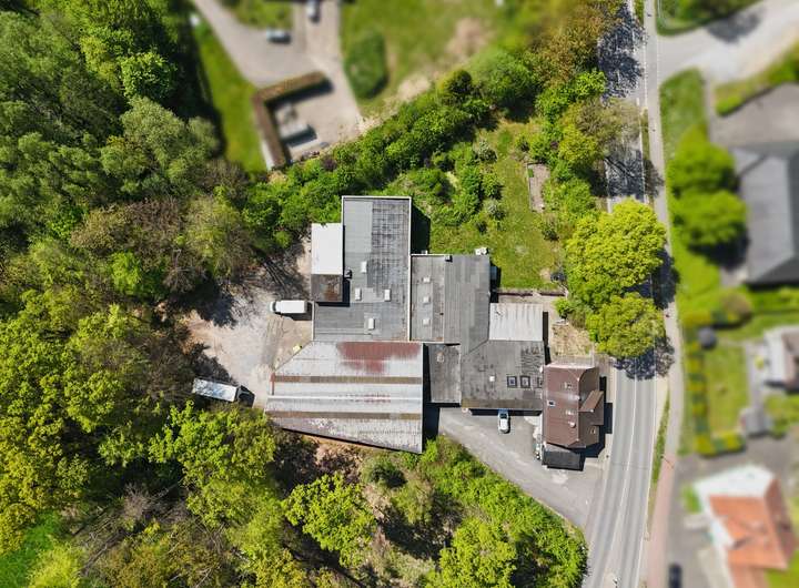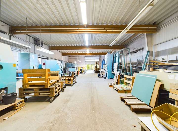 Der Lager-/Produktionshallenkomplex stammt aus dem Jahr 1919 und wurde ebenfalls kontinuierlich erweitert. Mit einer Nutzfläche von ca. 1.618,62 m² verteilt auf drei Ebenen bietet er umfangreiche Annehmlichkeiten: diverse Sanitärräume, mehrere Zugänge (Türen und Sektionaltore), Büroräume, Personalräume sowie einen überdachten Be- und Entladebereich.